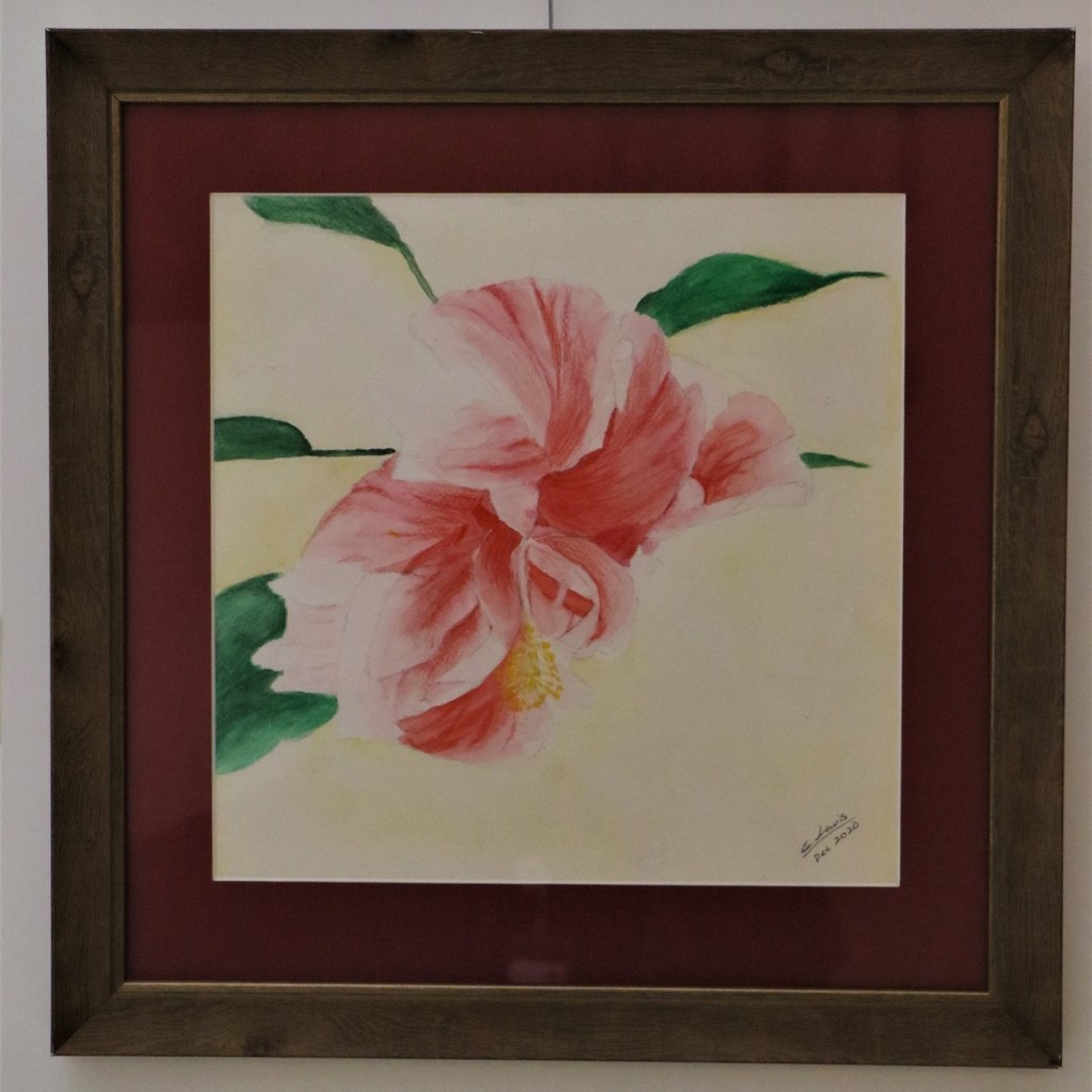 Pretty Pink Hibiscus’ 2020 – Watercolour on paper, Cleo Lewis.This drawing is the representation of love, peace, happiness, patience, calm and joy. It is the fourth of hibiscus watercolour collection