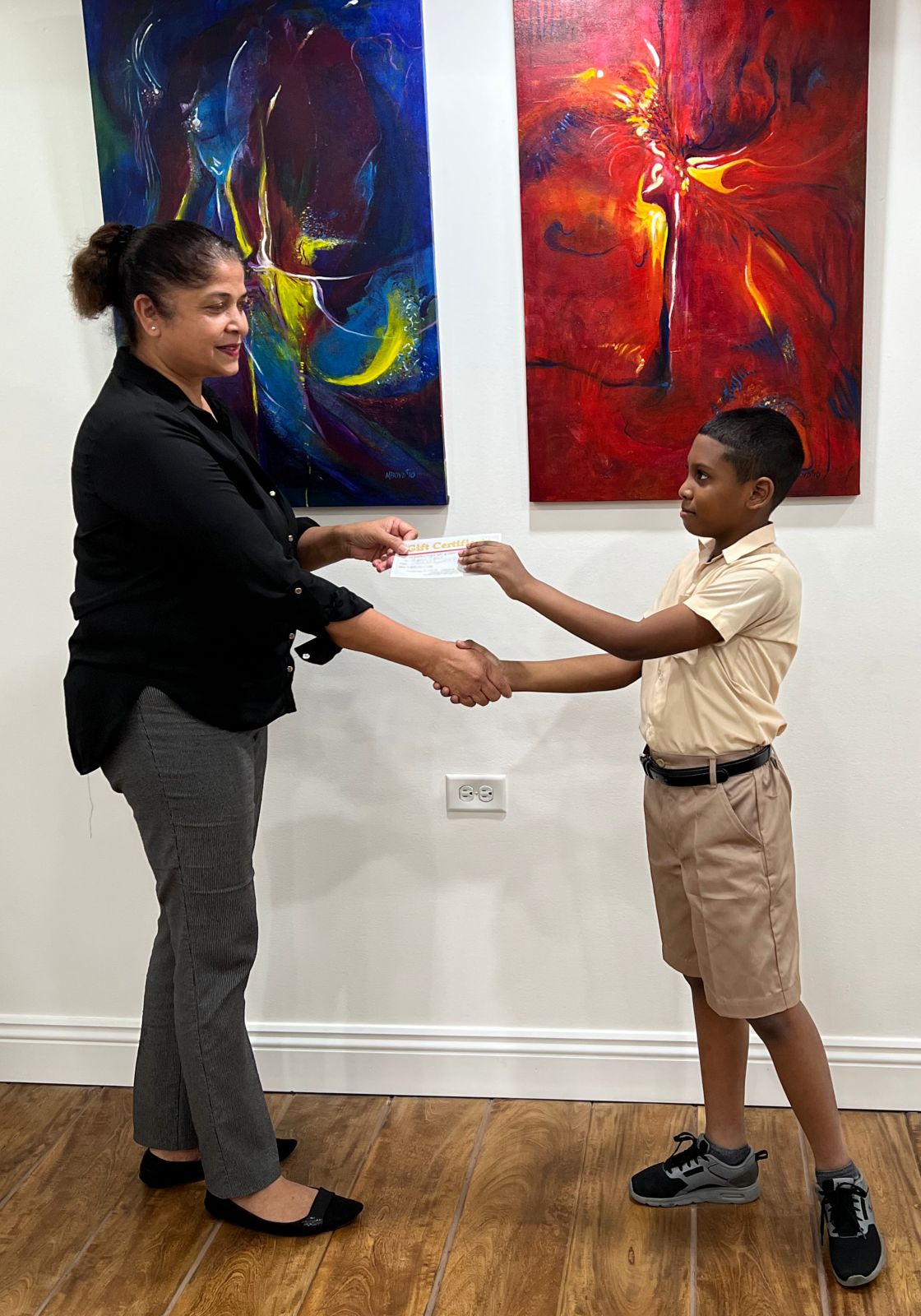 Ezekiel Molino of Rancho Quemado Government Primary School receives this young man captures my Humming Bird painting with a new perspective. He receives a $500 voucher for Honourable Mention from WIAOTT representative and owner of Perspectives, Michelle Boyd